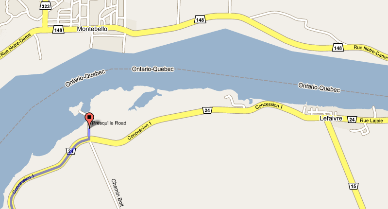 Sur "Mapquest" cliquez sur "US & Canada" et entrez "2890 Presqu’ile" dans le champ "Address or Intersection", "Lefaivre" dans le champ "City" et enfin entrez le "code postal" "K0B 1J0" dans le champ "Zip Code" ce qui vous dirigera au début de la chaussée (causeway) de Presqu’Ile.